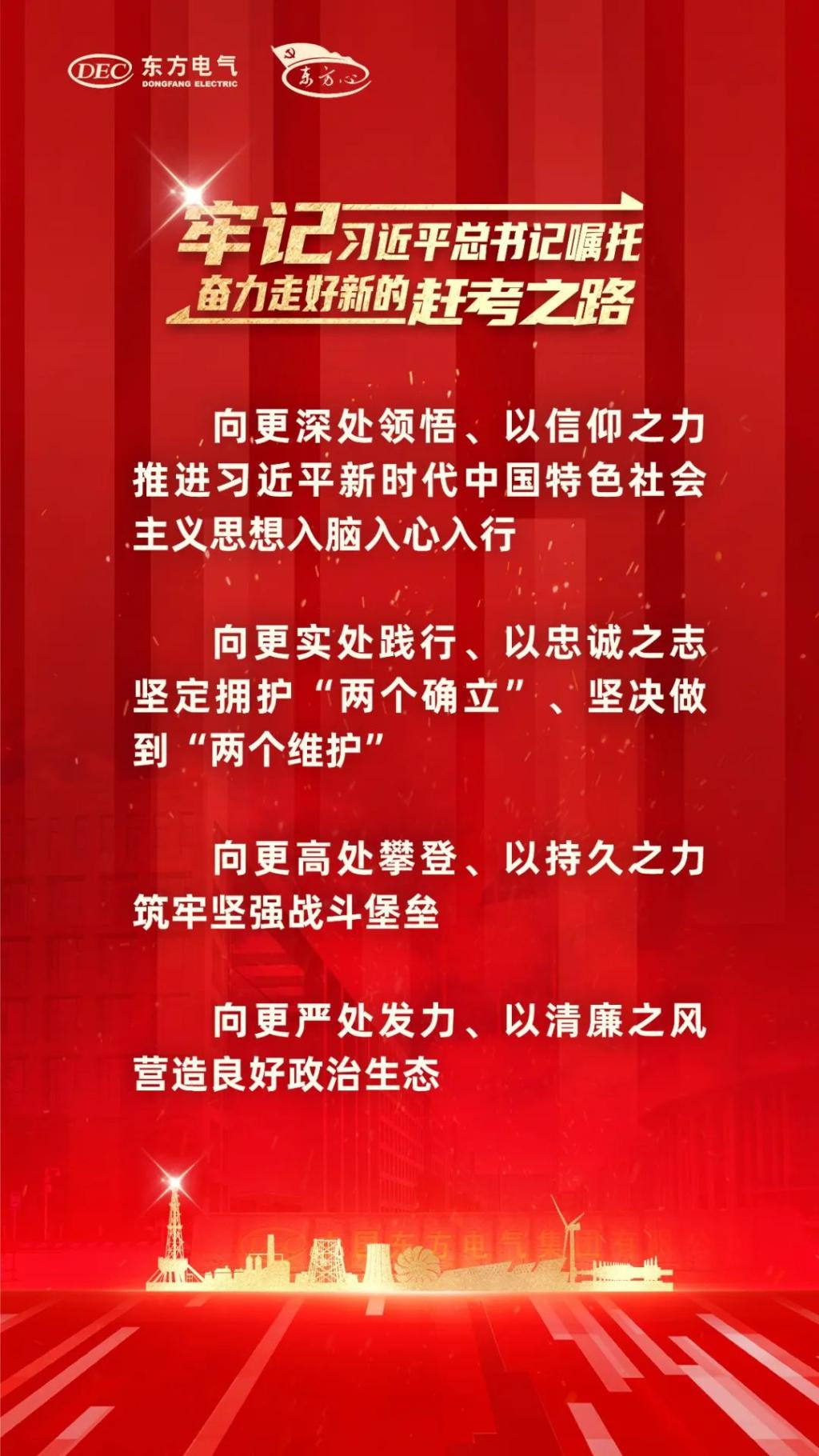 俞培根指出,2023年是東方電氣集團(tuán)攻堅克難、承壓前行的一年,面對嚴(yán)峻復(fù)雜的外部環(huán)境和多重疊加的困難挑戰(zhàn),集團(tuán)公司黨組高舉習(xí)近平新時代中國特色社會主義思想偉大旗幟,引導(dǎo)全集團(tuán)各級黨組織和廣大黨員干部職工團(tuán)結(jié)成一塊堅硬的鋼鐵,全面學(xué)習(xí)貫徹黨的二十大精神,認(rèn)真貫徹落實黨中央國務(wù)院決策部署,堅決扛起管黨治黨政治責(zé)任,持續(xù)大力實施“六大工程”,推動黨的建設(shè)跨越而行,以高質(zhì)量黨建引領(lǐng)保障企業(yè)高質(zhì)量發(fā)展邁出新步伐、開創(chuàng)新局面。 俞培根強(qiáng)調(diào),集團(tuán)公司已經(jīng)走過65年櫛風(fēng)沐雨、砥礪前行的趕考之路。趕考路上,一代代東方電氣人始終不忘初心使命,矢志艱苦奮斗,始終堅持黨的領(lǐng)導(dǎo)、加強(qiáng)黨的建設(shè),用鐵規(guī)鐵紀(jì)來管黨治黨,做到政治過硬、責(zé)任過硬、能力過硬、作風(fēng)過硬。新的趕考路上,要始終牢記習(xí)近平總書記“弘揚(yáng)可貴的‘東汽精神’”“做排頭兵、走在前列”的重要講話要求,堅持把高質(zhì)量發(fā)展作為新時代的硬道理,把推進(jìn)中國式現(xiàn)代化作為最大的政治,立足國資央企新使命新定位,錨定“十四五”經(jīng)營發(fā)展目標(biāo),搶抓新型工業(yè)化發(fā)展機(jī)遇,大力發(fā)展新質(zhì)生產(chǎn)力,以全面領(lǐng)先戰(zhàn)略加快建設(shè)世界一流企業(yè)。 各級黨組織和全體黨員干部職工務(wù)必要以“東方心”黨建品牌為引領(lǐng),以黨建“三年攀高計劃”“登高而招”為牽引,向更深處領(lǐng)悟,向更實處踐行,向更高處攀登,向更嚴(yán)處發(fā)力,接續(xù)奮斗、勇毅前行,形成全集團(tuán)共擔(dān)使命、共譜新篇、攜手奮進(jìn)、萬馬奔騰的生動局面,以東方電氣的“穩(wěn)”“進(jìn)”“立”為全國大局作出新的貢獻(xiàn)。